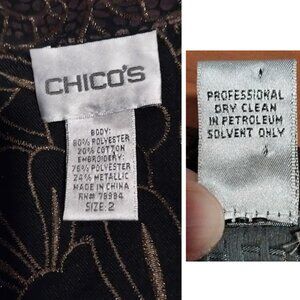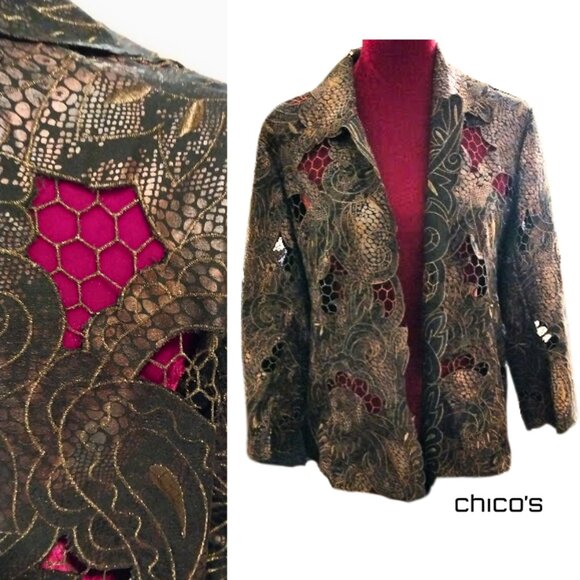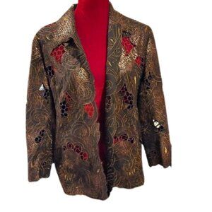 Chico's Size 2 Women's large or size 12 black & brown embroidered metallic open front scallop Light-weight Topper or Jacket