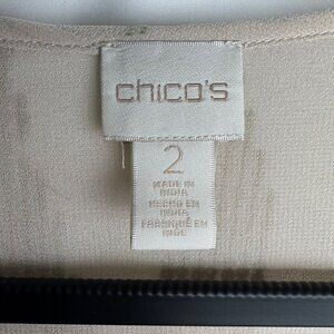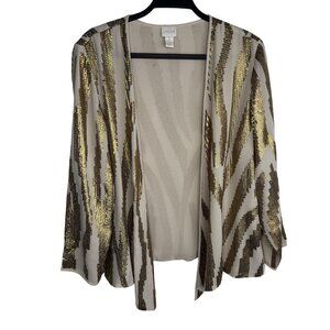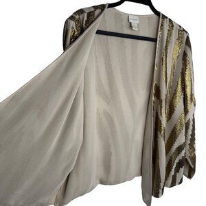 Chicos Size 2 Open Front Sheer Beige & Gold Sequin Kimono Jacket