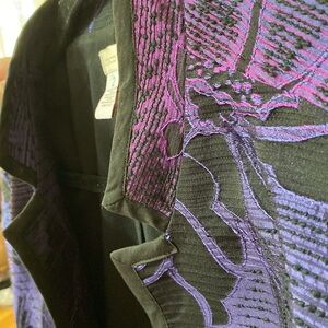 Color is Victorian purple in the Ombré Jacquard Jacket. Beautiful textured floral pattern with ombré black, purple, and pink. Perfect preowned condition in a size that will fit large or XL due to the open front of the jacket. Showstopper for sure! Lined jacket as pictured (no flaw there just textured side sewn into lining).