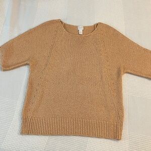 This was only worn once! Like new Chinco's texture shine Roz pullover sweater short sleeve in the color cantaloup. It has woven in metallic threads, I tried to get it pictured clearly but it didn't show up well. There is some subtle sparkle to this shirt! In great condition, feel free to ask any questions. Please review all photos for exact condition as they are included as part of the description. From a smoke free home, feel free to ask any questions! Thanks for looking!
