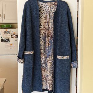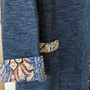 Chico's Size 2 heathered blue, cotton open-front duster with contrasting trim