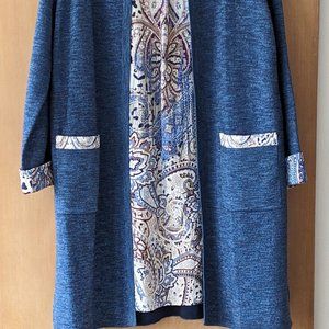 Chico's Size 2 heathered blue, cotton blend, open-front duster with contrasting trim on pockets and sleeves. Never worn. In like-new condition.