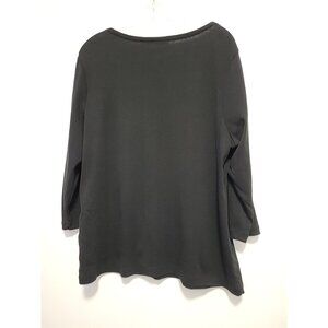 This Chico's blouse in size XL features a solid black color with studded detailing on the shoulders, adding a touch of flair to the classic design. Made from 100% cotton knit fabric, the blouse has a boat neckline and 3/4 sleeves, making it suitable for all seasons. The pullover style and casual sleeve type provide comfort and ease of wear, perfect for travel or casual occasions. Chest measures 44" Length 27".