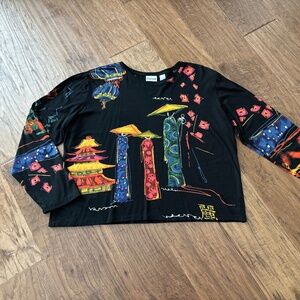 Chico's size 3 Asian print black red top women's size XL. Colorful top with an Asian theme. The print includes images of a pagoda, Asian women wearing conical hats and other abstract designs. Top is super soft, has a generous relaxed fit and is lightweight for year round wear. **See Pictures for Chico's Size Chart**