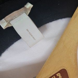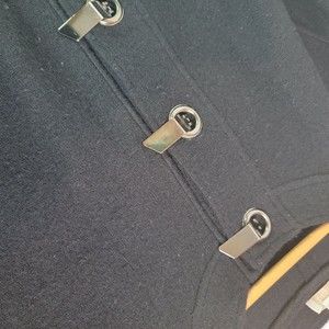 Gorgeous, black acrylic/wool blend sweater, with large weave. It is gently pre-owned, so it does have signs of being worn, such as slight pilling in "high contact" areas. Jacket features a round neckline, 3/4 length sleeves, and amazing metal flip-tabs for closure.
