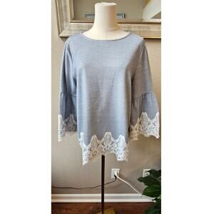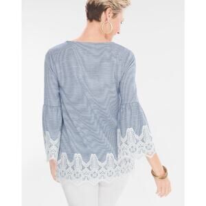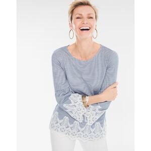 Chicos Size 3 French Striped Lace-Detail Top Women M Blue White Relaxed Pullover