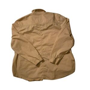 This is a Chico's women's size 3 large button-down shirt made of a lightweight cotton/nylon/spandex blend in a neutral beige color. It is designed in a regular fit and features a classic button-up style. Perfect for versatile styling in a casual or professional setting.