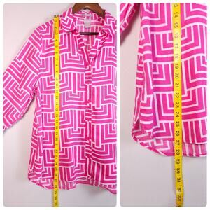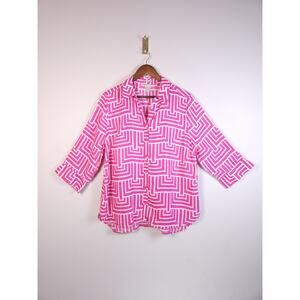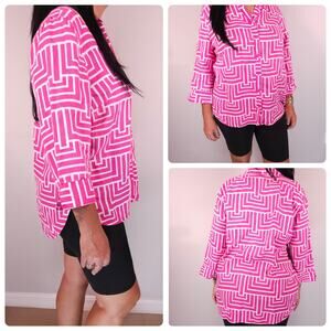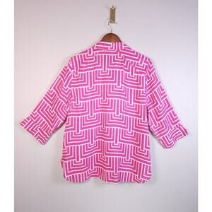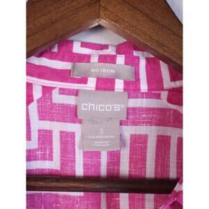 Chicos Size 3 No-Iron Linen Enamel Maze Loop-Back Tunic Top Blouse Pink Coastal