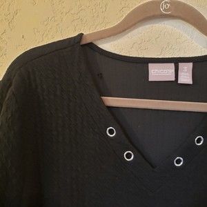 Chicos Size 3 Or XL/16 Black Textured Tunic Metal Grommets. Material is lightweight and very soft. Please note the last photo shows a small hole that is inside the back of the shirt. The hole does not show on the outside though.