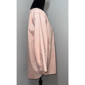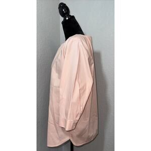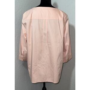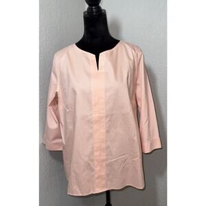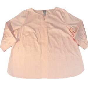 The Chicos Size 3 Pullover Quarter Length Sleeve blouse is a versatile and stylish top perfect for various occasions. Made from 100% cotton in a solid peachy pink color, this tunic features a V-neckline, pullover closure, and cuffed sleeves with buttons. With a regular fit and plus size type, this blouse offers comfort and ease of care, making it ideal for travel, casual outings, workwear, and business meetings. Its 3/4 sleeve length and easy-care, wrinkle-resistant fabric make it a practical choice for the summer, fall, and spring seasons. Made in Thailand, this Chico's blouse combines classic style with practical features for everyday wear.