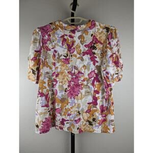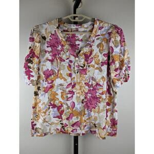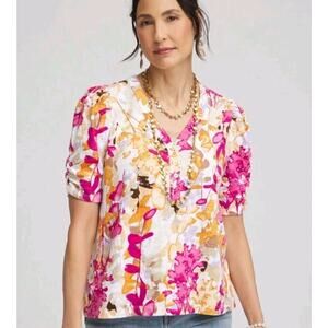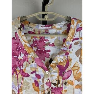 Chico's Size 3 US XL Slub Knit Split Neck Henley Tee. Puff sleeve with gathers. V-neck with gold button detail. Colorful floral - cream background with pink, orange purple and green.