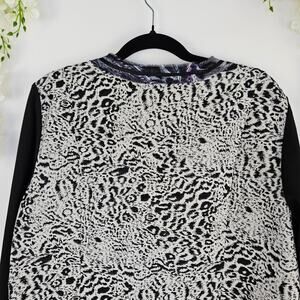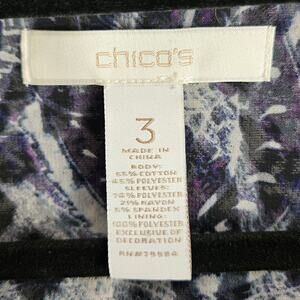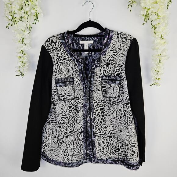 Chic and eye-catching Chico’s women’s open-front blazer jacket in size 3 (fits like XL / 16). This stylish piece features a mixed-media design with an animal print front and back in tones of black, white, and gray accented with deep purple. The solid black long sleeves and soft stretch fabric create a flattering, comfortable fit that’s perfect for both casual and dressy outfits.