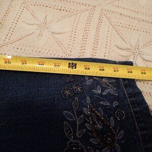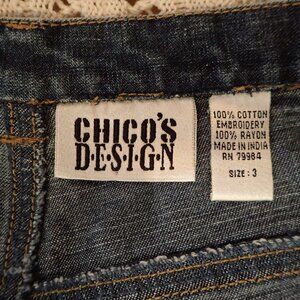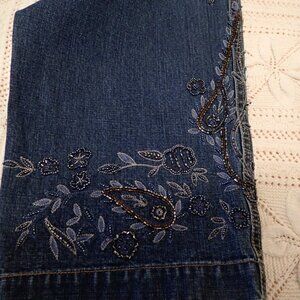 Size 16. Bluejeans. By Chico. Their size 3. equal to about a 14 - 16. Beautiful beading at leg openings. No rips or tears. Smoke and cat free home. No missing beads. Two side pockets. Two read pockets.