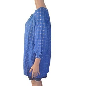 Blue button down tunic with metallic windowpane design. These squares are sheer with metallic silver threading running through creating a window effect