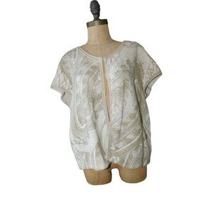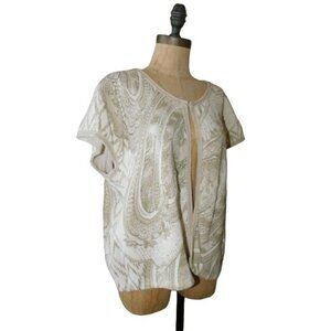 This Chico's Size XL (3) jacket vest top features an elegant knit style. Its versatile design is perfect for any occasion, offering a blend of comfort and sophistication. Single hook closure, knit fabric with slight cap sleeves, open front, boxy unstructured style with braided trim and elegant print fabric with beaded accents