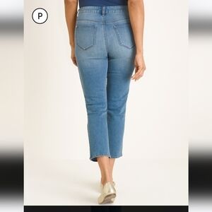 The Fit: Crop length with slim fit; slim through the hips and thighs to the knees; rise sits just below the natural waist; 5-pocket design with zip & button closure; 24" regular inseam; 22" petite inseam.