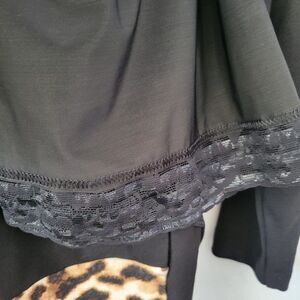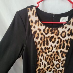 Black, brown animal/Leopard print in the front. The back has a zipper and a hook/loop closure. Round neck, 3/4 sleeves. The underlayer has a slimming Spanx-type material. The liner has black lace at the bottom.