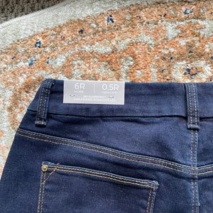Classic slim fit; front & back pockets, front & button closure. 92% cotton, 6% polyester, 2% lycra.