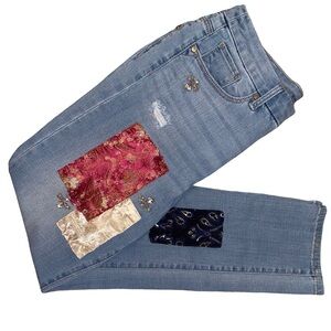 These Chico brand jeans feature a slim leg and ankle silhouette, rhinestone and patchwork details on front legs, distressing features, high waist, traditional five pocket design and a zip and button closure.