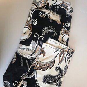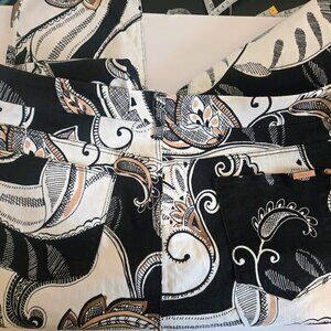 Chico's So Slimming ankle pants in a bold black and white floral/ paisley pattern, with front and back pockets.