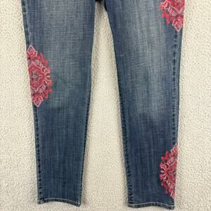 • Style: So Slimming Medallion Embroidered Girlfriend Ankle Denim Jeans Pink Red Comfort Stretch Boho Indie Casual Feminine Date night