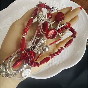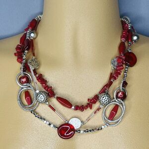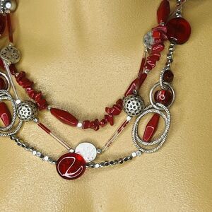 Chico's Statement Necklace Layered 3 Strand Beaded Red Silver Tone PRETTY 1093