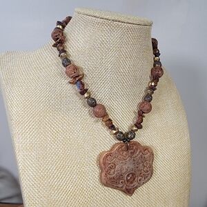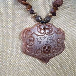 Beautiful mixed beads statement necklace with jade like medallion. Carved in lettering. Earth tones.