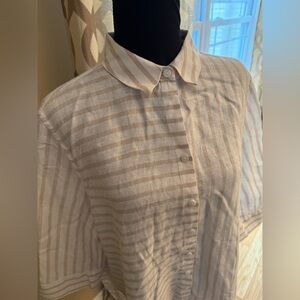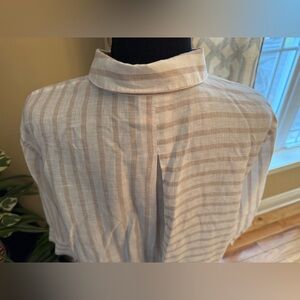 Chico’s women’s 3/4 sleeve button down collared shirt, size 3P (US 16/18P). Beige/White striped. 100% Linen. EUC. No rips, holes, stains or odors. Please see photos for item details/dimensions. Some photos may appear different in color due to lighting. Ships from smoke-free home.