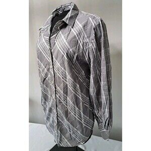 Chico's diagonal striped gray, long-sleeve, collared, button-up shirt.