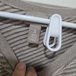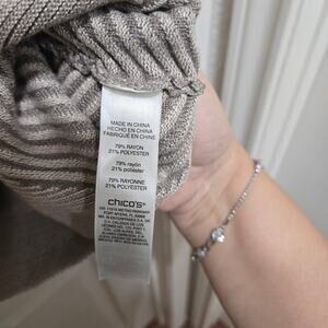 Chicos top womens size xl 3 gray striped heavy knit 3/4 sleeve sweater everyday length is 28in armpit to armpit is 22in from shoulder to end of sleeve is 21in measurements are approximate not exact and is not doubled and are measured with the item laying flat