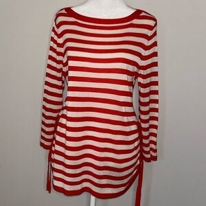 This striped sweater is in Excellent Used Condition (EUC) and features a flattering exaggerated neckline plus lace-up sides with grommet details for a touch of style. Made from a lightweight and super soft knit, this piece is perfect for layering or wearing on its own.