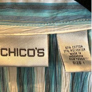 Chico's striped, button-down blouse in excellent condition. It's a Chico's size 1, which is equivalent to a size medium. Measures approx 25" long and 20" pit-to-pit