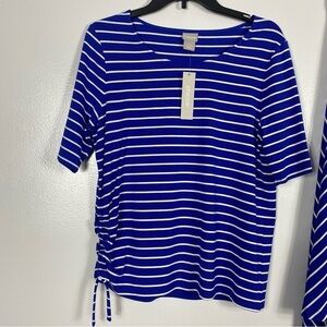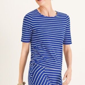 Fits close to the body with elbow sleeves, scoop neckline, and side ruching.