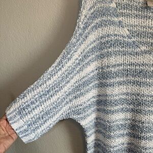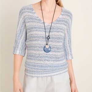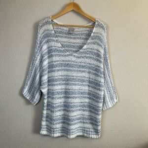 Chicos Striped Tape Yarn V Neck Pullover Sweater Light Blue Stripe Linen Blend
