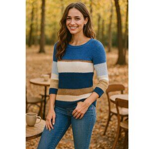 Chico's Striped Textured Pullover Sweater in blue, tan, brown & white wide stripes. Perfect weight for in-between seasons. Textured, cotton-blend fabric. Classic fit with 3/4-sleeves and scoop neckline.