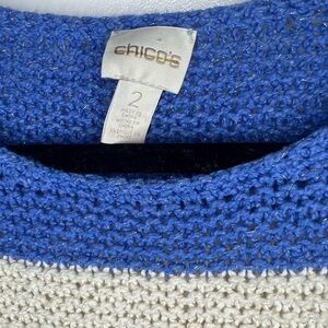Chico's Striped Woven Blue White Sweater, l, preowned in great condition, no visible flaws shimmer thread, slight high low design, Questions? Leave a comment below!