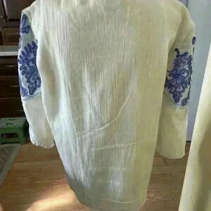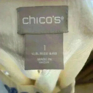 Chico’s Summer Blouse. Size 1. Cream with blue coral pattern which is raised above material like embroidery to form the coral. Sleeves are 3/4 bell shape. See photo of material and blouse is lined. Beautiful top #251H