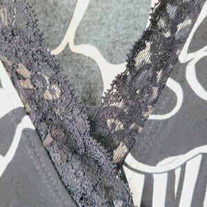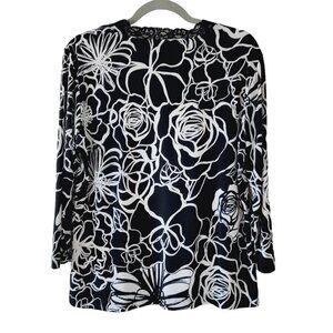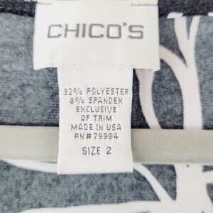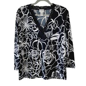 Chico's Surplice Blouse Sz 2 (Lg) Black & White Floral Lace Trimmed Neck 3/4 SLV