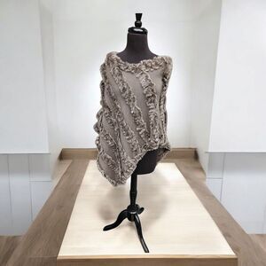 Add a touch of sophistication to your wardrobe with this Chico's sweater poncho shawl. The taupe color and old money mob wife theme make it perfect for any occasion. The round neckline and faux fur trim accents add a touch of glamour to this stylish cape. Made of a soft blend of cotton and acrylic, it's comfortable to wear all day long. This sweater is a size small and fits regular size types. The striped pattern adds a touch of elegance to this versatile poncho. Ideal for women, this sweater is a must-have for any fashion-conscious individual.