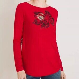 Chicos Sweater Size 1 (Medium) Red Floral Embellished Bateau Neck Long Sleeve