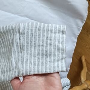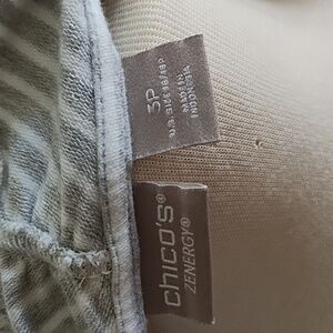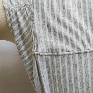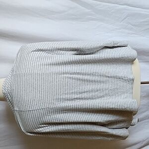 Soft gray and white striped open front sweater. Front hem comes to point. Can be worn long or tied. 24 inches across. 26 inches long