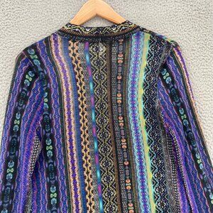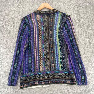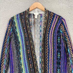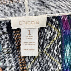Chicos Sweater Womens 1 US Medium Blue Multi Pattern Cardigan Open Front Stretch