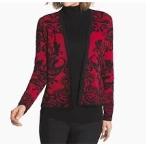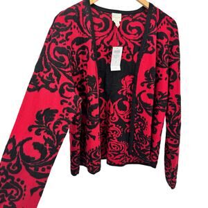 Chico's Sweater Womens Large Red Black Jacquard Knit Veera Open Cardigan NEW