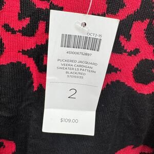 Chico's Sweater Womens Large Red Black Puckered Jacquard Knit Veera Open Cardigan Long Sleeve Wool Blend Modern Artsy NEW