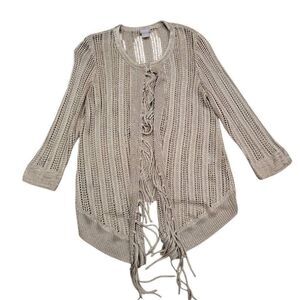 Chico's Sweater Womens Medium Beige Knit Fringed 100% Rayon Drape Front Cardigan