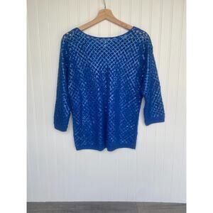 Chicos Sweater Women's Sz 1, Blue 3/4 Sleeve Kinetic Open Knit Sasha Sequins