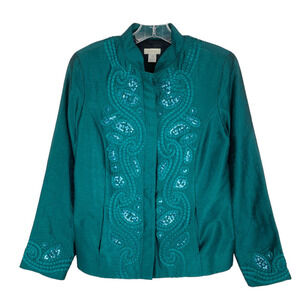 Chico's Sz 0 S Holiday Green Beaded Button Front Jacket Lined Mandarin Collar