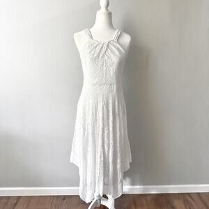 Beautiful Chico's white eyelet lace handkerchief hem halter dress, size 0, equivalent to women's size small.