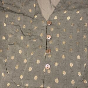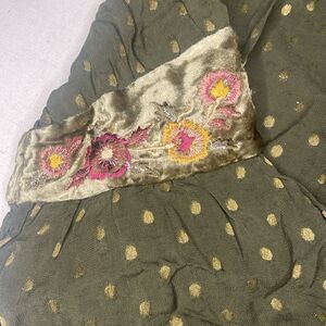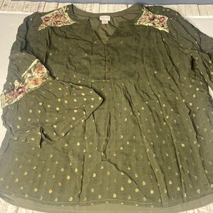 Chico’s Sz 1 Green Dot Jacquard Lined Peasant Top Velvet Floral Trim
