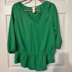 Chicos Sz 1 Kelly Green Blouse V Neck 3/4 Balloon Sleeve Peasant Top Embellished